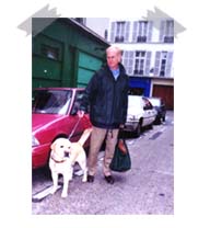 一杯ひっかけた後(?)のような、ごきげん赤ら顔&前髪がキュートなおじさん。イヌ共々、目線がどこを向いているのか。